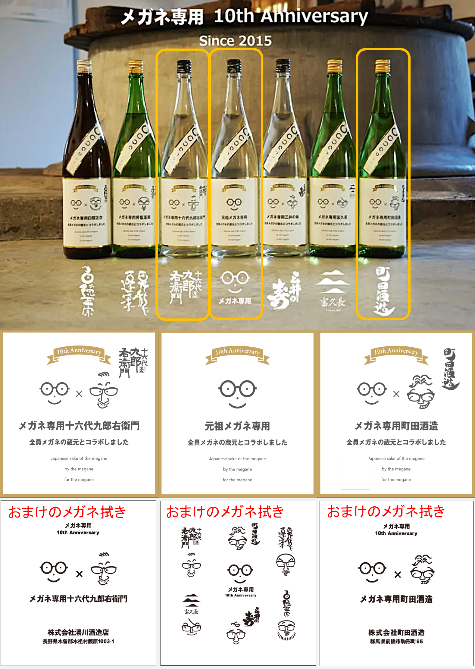 毎年10月1日の「日本酒の日」&「メガネの日」に合わせて発売となっている「萩野酒造/メガネ専用」ですが今年で10周年となります。10周年を記念して萩野酒造と親交のある「メガネの蔵元」6蔵元とのコラボ限定酒が企画されました。萩野酒造を含め全7種類の「メガネ専用」です。